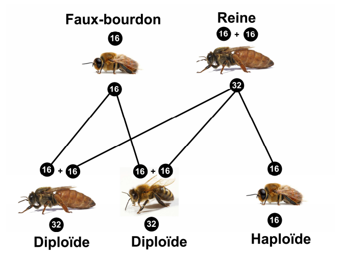 pour faire plus simple, la reine transmet ces 16 chromosomes, qui constitue 100% de sont patrimoine génétique. Toutefois sa spermathèque va lui permettre de donner AUSSI 100% de la génétique du mâles, uniquement aux filles qui sont issues d’oeufs fécondés. Capito?