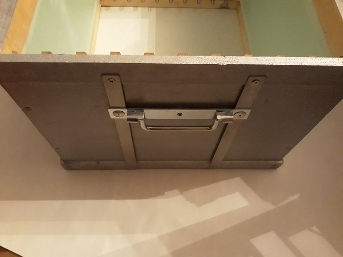 Nous avions évoqué le prix des ruches polystyrène, le prix étant un argument hautement dissuasif, j’ai contourné la difficulté en assemblant des panneaux de polystyrène, avec une ceinture bois en haut et en bas, ce qui permet d’avoir des crémaillères, de pouvoir y visser des vis, et ne pas craindre le lève-cadre. Les poignées, c’était un peu plus compliqué, mais le dispositif permet une “sécurité” d’assemblage de bas en haut !
