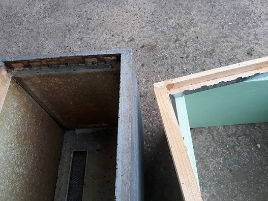 droitegauche de la photo, c’est une ruchette 6 cadres, l’encadrement supérieur a été collé il y a au moins 3 ans et ça ne bouge pas !