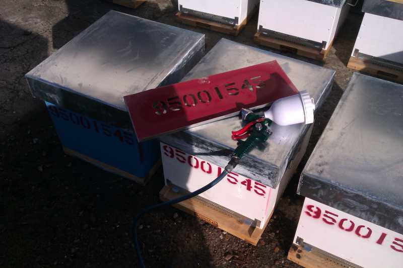 Numero d’apiculteur au pochoir avec pistolet à peinture.