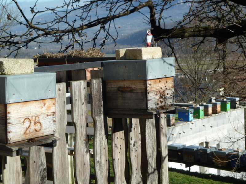 chez mes parents il y a toujours ruches en haut du jardin entre deux routes et dans le village.