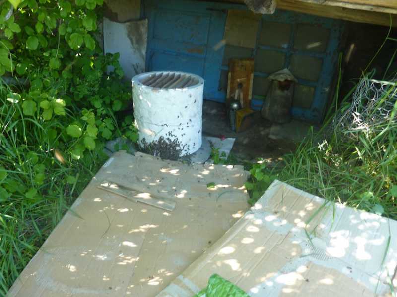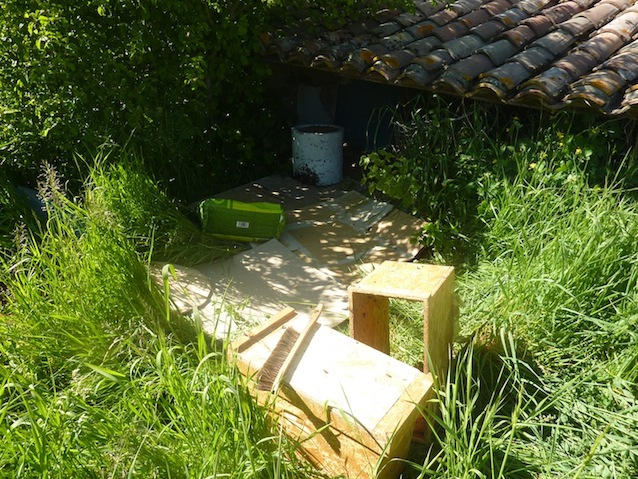 Dimanche dernier, nouvelle intervention. Je vous rappelle la situation depuis l’année dernière : un EA dans une ruchette posé sur la fameuse ruche, dans l’espoir que les abeilles descendent la coloniser… (v. plus haut).