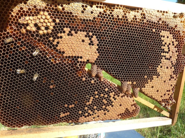 Et en le regardant au soleil au moment de déposer les cadres dans une ruchette au rucher, je constate qu’il n’y a que du couvain operculé, pas une seule larve, pas un seul oeuf… du miel frais au milieu du couvain…