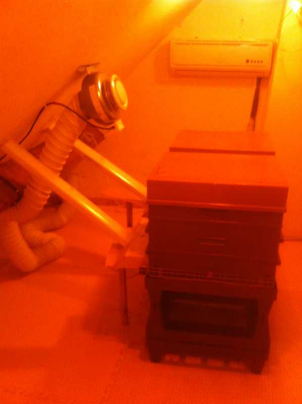 J’ai aussi installé des chatières à côté qui donnent directement dans le grenier. Les abeilles qui s’échappent de la ruche lors des manipulations volent dans le grenier et lorsque j’éteins, sont attirées par le jour des chatières. Elles sortent alors par là et retournent à la ruche par les chatières des tubes PVC.