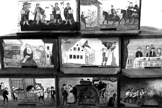 La grande originalité des ruches slovènes réside dans la décoration de leur Fronton. Celles que vous avez sous vos museaux :) sont des scènes de la vie quotidienne populaire et apicole. Celles ci sont datées du XIX e