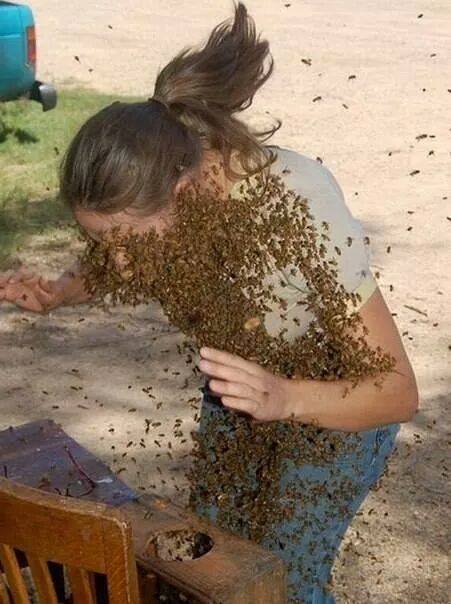 Oui, ça sent le pari stupide, parce qu’elle ne s’est pas laissée couvrir d’abeilles en quelques secondes… mais on voit un mouvement brusque. Je serais preneur pour une photo quelques secondes après… hein Pierrot ?