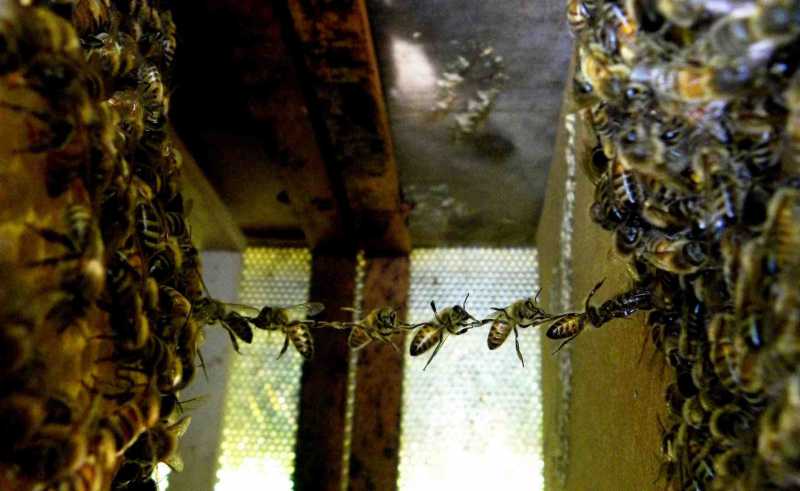elle cherche la reine sur les vieilles cires et quand il n’y en a plus elle preleve la ou il y a le plus d’abeilles, ecarte lles doigts pour faire sa recherche