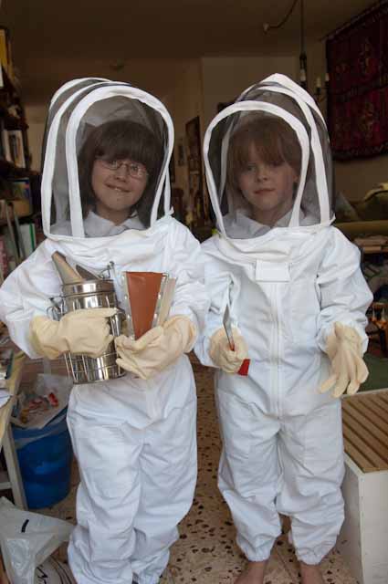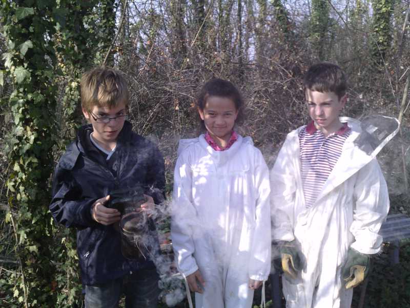 Les deux extérieurs sont mes fistons. Non : étaient mes fistons, parce que la photo date de trois ans et me fistons d’aujourd’hui, ça fait un bail qu’ils ont mieux à faire que d’accompagner leur dabe au rucher.