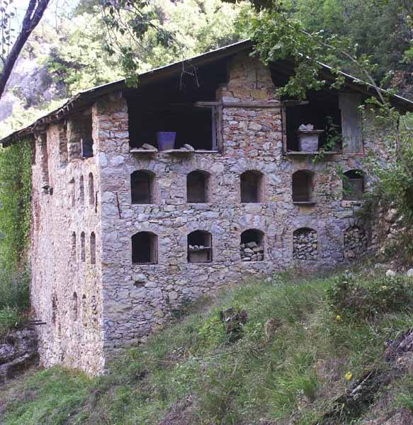 Vieille maison à abeilles en montagne. Cette bâtisse était destinée à recevoir des ruches que l’on disposait dans les ouvertures. Pendant les grands froids, les ruches étaient retirées à l’intérieur du bâtiment.