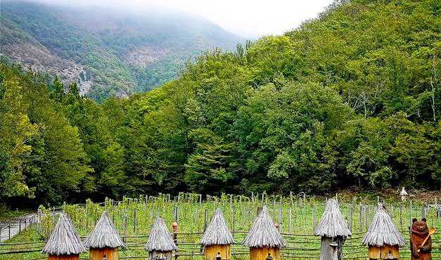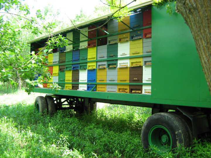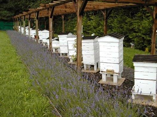 Seul les cadres coulissent.Un rucher pavillon composé de plus de 60 ruches du même type.