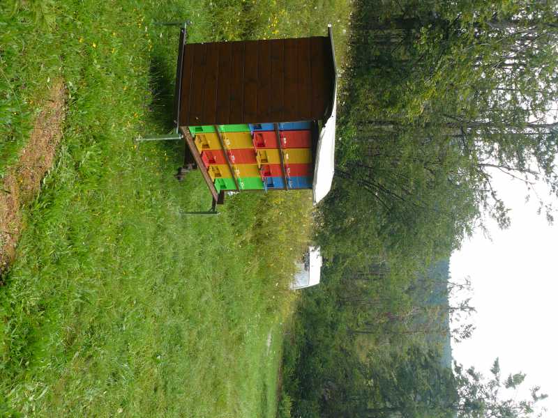 on?l’abeilles Carnica n’utilise que très peu de propolis. les cadres coulissent sur deux tringles métalliques. La ruche est à deux étages de 9 cadres (un peu plus petit que des cadres Dadant )en bâtisse froide et il y a la place pour 3 cadres suplémentaire sur les 2 étages (donc 6) en bâtisse chaude au plus près de la porte.