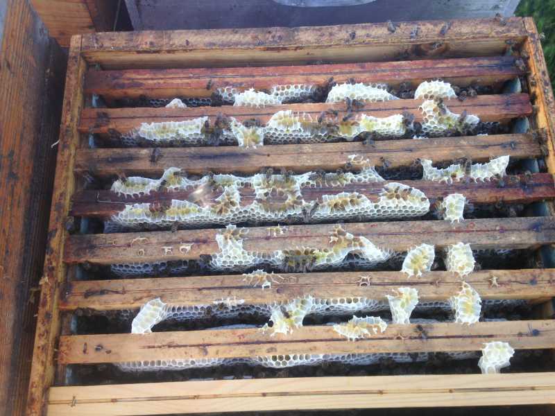 Cela me sert de leçon : en cas de mauvais temps et quand les abeilles sont coincées à l’intérieur de la ruche, elles ont vite fait de mangé le stock et de se retrouver en situation de famine ; et qu’il faut mieux se risquer à mettre un peu de sucre dans la ruche (et éventuellement risquer à en mettre un petit peu dans le miel) plutôt que de voir crever son cheptel !Je dis peut-être une connerie, mais je suis très surpris de lire qu’à cette époque des ruches meurent de faim!
