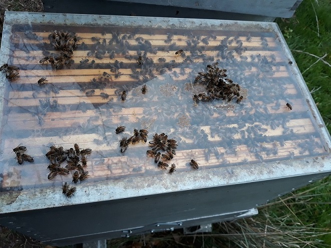 Donc, en plus du problème Nosema Ceranae, la colonie pourrait avoir eu un problème de densité de population, soit un mémérage trop tardif (qui n’aurait pas abouti), ce que je ne pense pas, vu sa position (*), elle a collé au dernier groupe d’abeilles qui pouvait la nourrir, hélas ! … plus de GR … la mort pour la reine aussi….