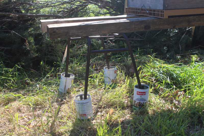 Resteront 50 essaims de rab qui vont se remerer naturellement ou pas, brusque retour en arrière pour voir si la nature a encore des réponses positives.En réponse aux fourmis hier j’ai fait un super bricolage pour tester (pieds de vieilles chaises et boite de café, mode magasin fermé coronavirus). Ben ça marche. Maintenant il faut que je calle ça un peu mieux