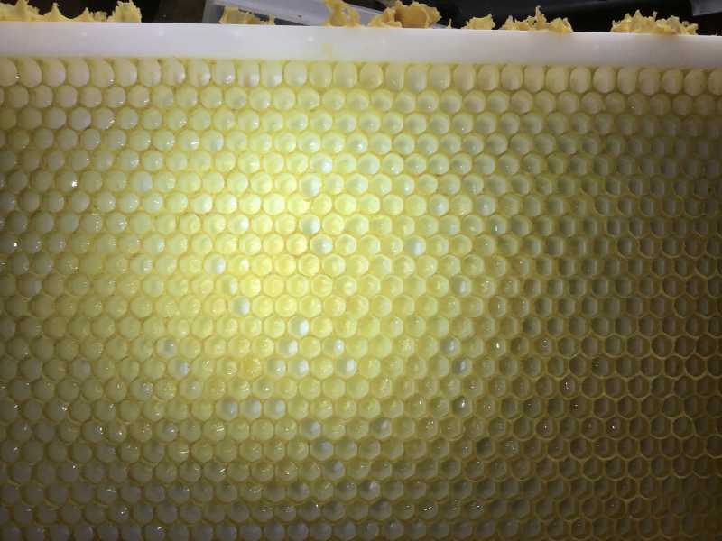a+Ici les acacias commencent juste à sortir , j’ai regardé il y a bien des fleurs et le sol est toujours humide , pas d’avance part rapport à l’année dernière pour une fleuraison vers le 20 mai , d’ici là…….. . Sur les ruches en retard dimanche elles ont reçu un cadre de cire gaufrée ( une demi ) étirer en partie avec de la ponte et un bon travail en partie basse se soir . Les températures sont bonnes et le nectar de pissenlits rentre , les genet sont en avances . Se soir après avoir contrôlé le greffage d’hier qui était pas terrible j’ai changé de cadre de prélèvement en utilisant un plastique ou il y avait une uniformité de larves et surprise la plume passe mieux sans rien casser , à voir si il y a de bon résultats