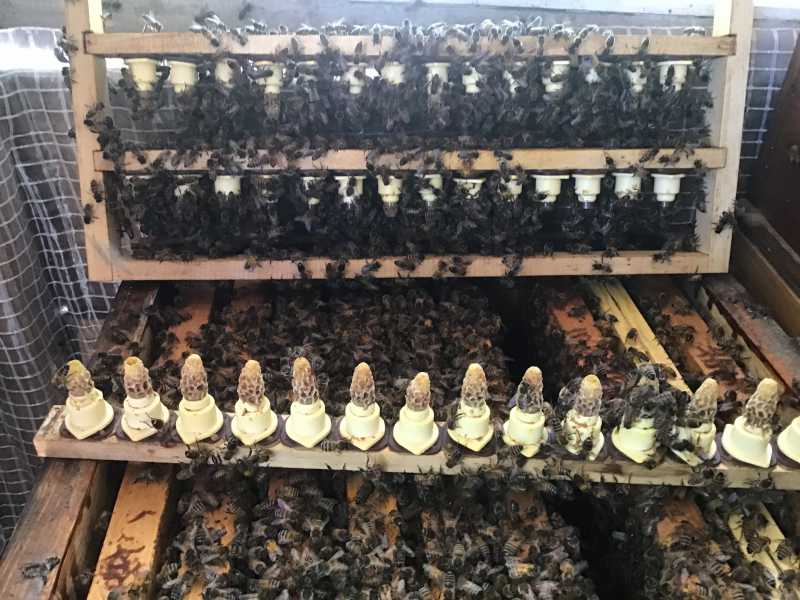 J’ai été surpris à la vitesse où les corps de ruches déplacés ( avec reines ) rentrées déjà du pollen le lendemain , distribution de cr dans cache pour les orphelinée sur dix je n’avais qu’une reine qui était dans le corps du bas . Sur les ea où j’avais lâcher des reines des bigoudis ( le 12 ) je n’en ai vu qu’une qui ne pond pas non plus donc cr aussi pour tout le monde , ils ont pris le va et viens , aucune désertions . Les ruches qui étaient faiblardes et laisser sur le côté sont maintenant avec de belles populations et ont avalé 2,5 kg de candi en une semaine mais les cadres de rive reste vide ( 2/4 ) . Sur la ruche éleveuse il ne me reste que 4 cr avec bigoudis , je me suis dis que c’était dommage en fin de journée de laisser cette place non occupée je suis donc monté greffer sur la souche , tournée le cadre comme d’habitude , et là des gouttes de nectar visqueux avec un goût bien prononcé . Des fois ont se plein pour pas grand chose mais là j’ai ressenti une petite victoire en sortant de la cabane , il a fait 28° .
