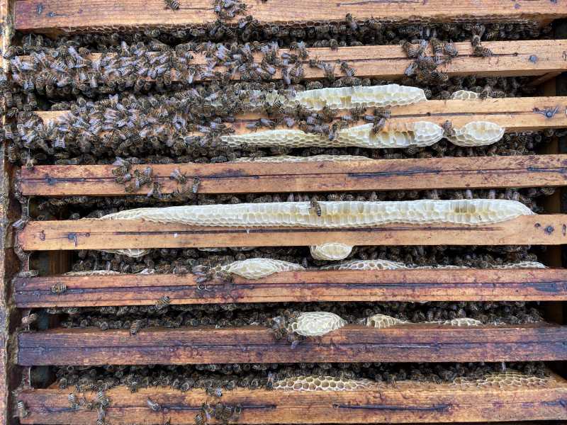 Ça fait un mois et demi qu’elles sont sur 6 couvain, vu que ça miellotait juste je ne les ai pas agrandis plus, mais elles ont fait de l abeilles
