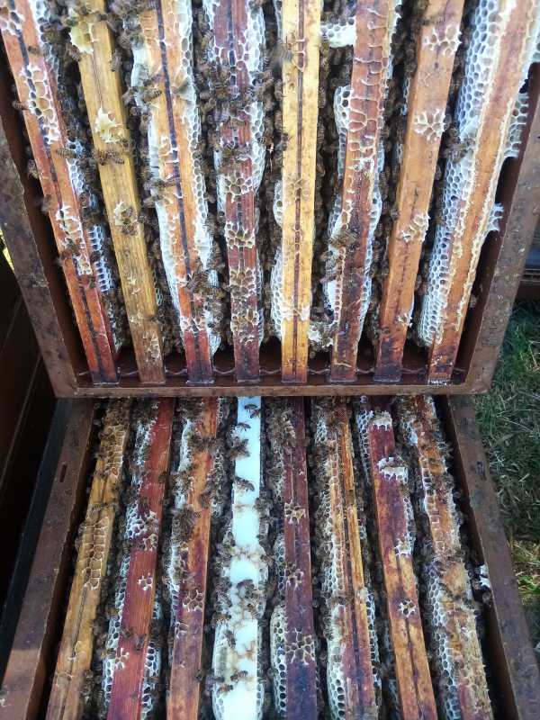 Ici la miellée de printemps devrait se terminer courant/fin de semaine prochaine. 28 degrés aujourd’hui, ça bosse dur sur les sycomores et les aubépines. Ma championne de l’année (toujours reine bleue) arrive à la moitié de sa 6ème hausse !!!