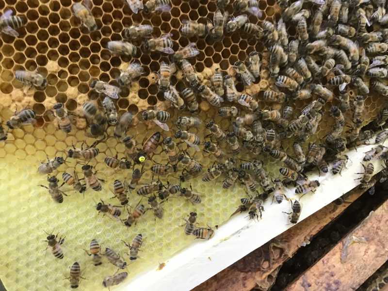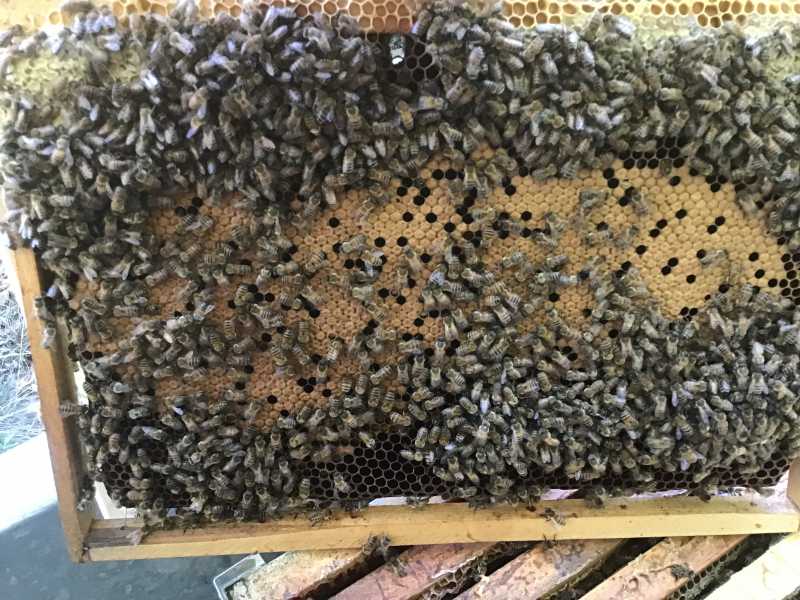 Ici 2021 c’était zéro et candi toute la saison , une perfusion . 2022 ( miel de printemps / acacias / châtaignier ) je suis à 40 kg de moyenne et il reste maintenant à voir pour le tournesol . Hier j’ai ouvert les ruches qui sont restés sur place qui ont servis pour l’élevage et la récolte de châtaigniers , les hausses sont presque vides depuis , par contre les corps sont blindés , les cadres pèsent , j’ai trouvé du couvain de tous âges , les ea sont jolis mais demande un apport pour faire des réserves . Voilà un cadre d’une de mes reines 2022 .