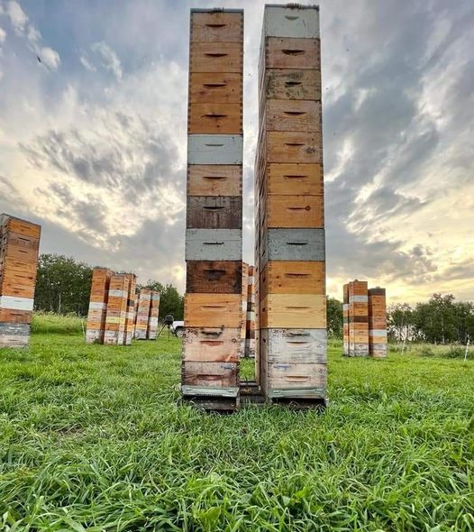 Avec une grue sur plateau pick up il prend 4/5 hausses à la fois mais en général ça ne dépasse pas 6hausses il récolte 4hausses à la fois et rajoute des hausses vides et les ruches se retrouvent vite une nouvelle fois avec 4hausses !