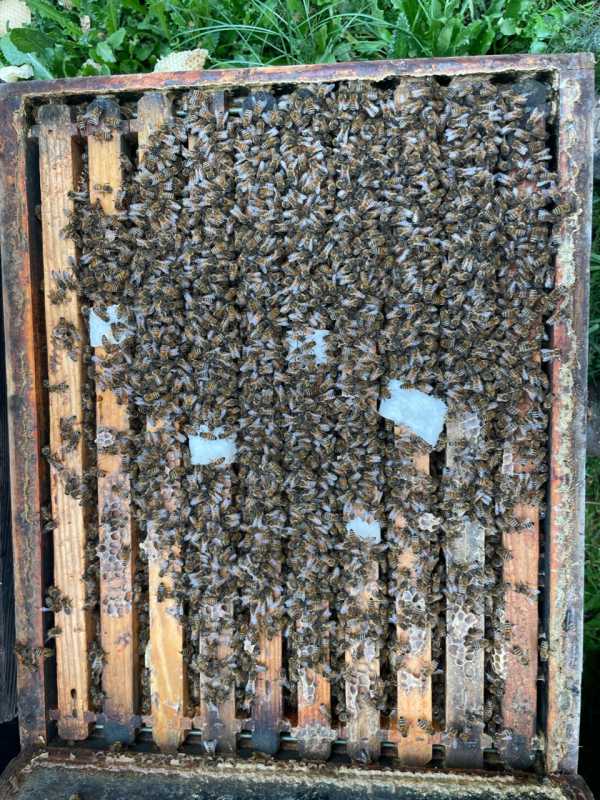 C’est populeux, la ponte démarre pour les essaims d’août , pour les colonies il y’a 2 mains de couvain operculé, du couvain larvé et de la ponte.