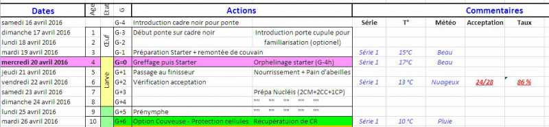 La première série n’est pas toujours bien acceptée, il faut que la colonie apprenne ce que lui impose l’apiculteur, car la souche n’est pas en fièvre d’essaimage à G+0.