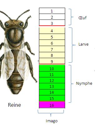 voici le développement des reines en phase larvaire / pré-nymphe / nymphale.