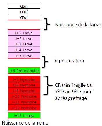 salut! moi j’attends 48h comme ça tu les vois facilement, elles commencent à batir les cellules. Avant tu peux les voir mais il faut regarder au fond des cupules si il y a de la gelée, c’est moins pratique. Et après je revérifie quand je mets les bigoudis.