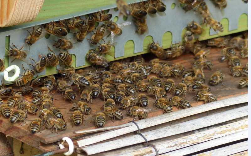 Le phénomène a commencé vers le 15 Août, elles stationnent sur la planche d’envol et sont de plus en plus nombreuses à le faire, sur la ruche mère elles envahissent à présent la moitié de la façade jusqu’au haut vent et je pense qu’elles y passent la nuit, ce matin 16° à 6h le jour se levait à peine que la planche et la façade était noir de monde, à 10h (entrée ensoleillée) seule la planche d’envol était couverte d’abeilles et en y regardant de prêt, beaucoup grattent le bois et la porte métallique avec leur deux pattes avant et semblent lécher le sol d’autres se frottent les deux pattes arrière comme pour ce débarrasser de reste de pollen. L’envahissement est tel que les butineuses ont du mal à entrer et sortir.