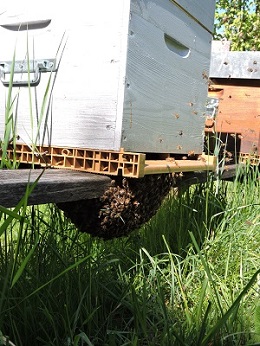 Vendredi 1er essaim accroché sous la ruche et je vois une petite reine vierge ce trimballer sous la planche d’envole sur l’essaim (photo)