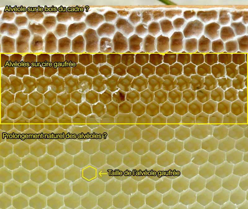 1) Pourquoi les alvéoles construites naturellement au delà de l’amorce de la cire gaufrées sont-elles plus grandes?