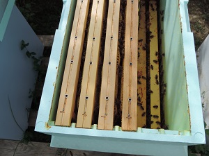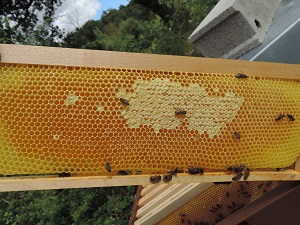 Les carnica en ruchette ont bien bossé, miel operculé dans 3 cadres sur 6. Ce sont des hausses avec un espacement élevage (opercules sont au niveau du bois).