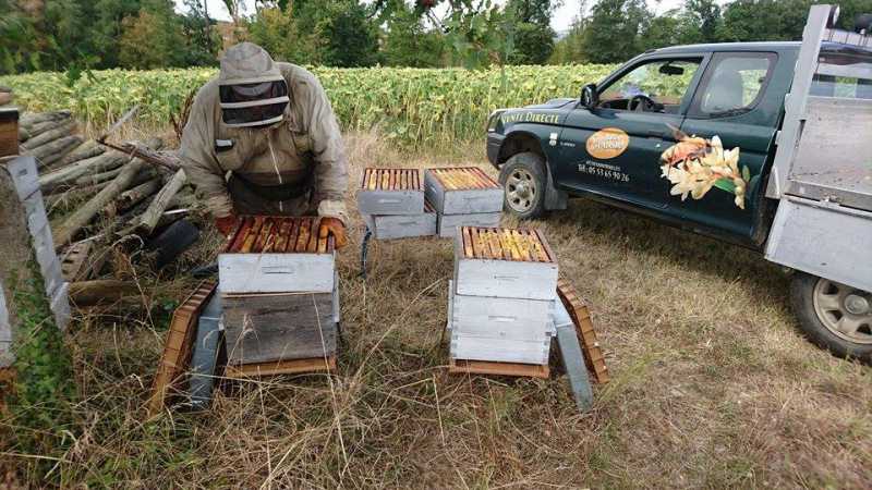 je soufle toute les 4 ruches en principe et je pose les hausses par 4 ou 5 sur le plateau du 4×4 fermé avec un toit de ruche!!