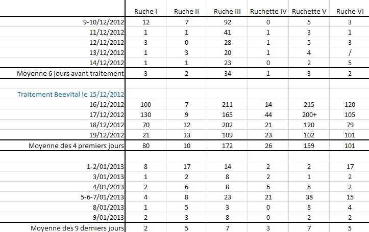 Tu veux dire quoi ?A mon avis il voulait dire que comme Beevital ne tue pas les varroas mais les fait tomber des cellules ou ouvrières sur lesquels sont installés, si le fond de ruche est plein, ils peuvent remonter après avoir repris leurs esprits.