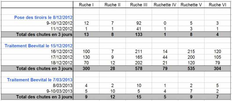 J’ai remanié le tableau précédent pour cette fois obtenir des totaux de chutes sur trois jours plutôt que des moyennes. Trois jours c’est peu mais ça donne déjà une idée de l’infestation avant et après traitements.