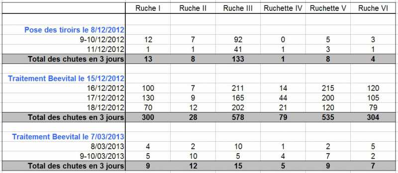J’ai commencé le traitement d’été ce samedi et les chutes journalières sont faibles, comparables à début mars (voir tableau ci-dessous). C’est de bonne augure !