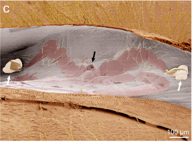 De chaque côté, des crochets solidement plantés dans l’abeille, entre les deux l’orifice dans lequel il plante son appareil buccal. Il est tellement accroché, que les pattes ont cassé, alors que les crochets sont restés en place ! Vous comprenez pourquoi c’est difficile de le faire tomber ou même de l’atteindre, car là, il est dans la partie ventrale de l’abeille, planqué, abrité entre deux écailles, quasiment invisible !