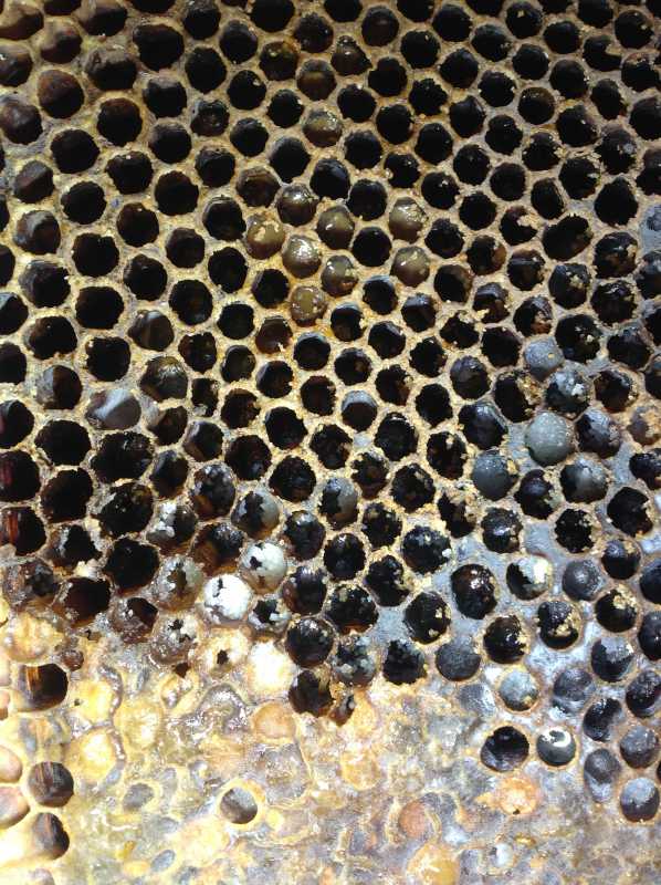 J’te dirai pour l’odeur quand je l’aurai sous le nez. Je ne suis pas sûr que la photo soit explicite , on est d’accord pour les opercules, c’est du miel et les alvéoles un peu jaune au centre en haut, je pense que c’est du pollen détrempé, comme les zazas d’ailleurs, on a l’impression qu’elles sortaient de l’eau; blanc à mi hauteur à droite je sais pas ce que c’est.