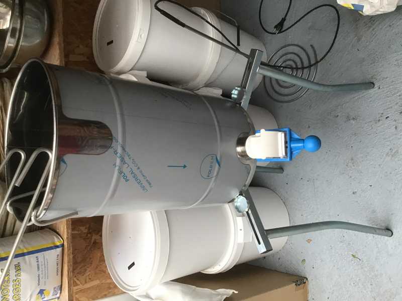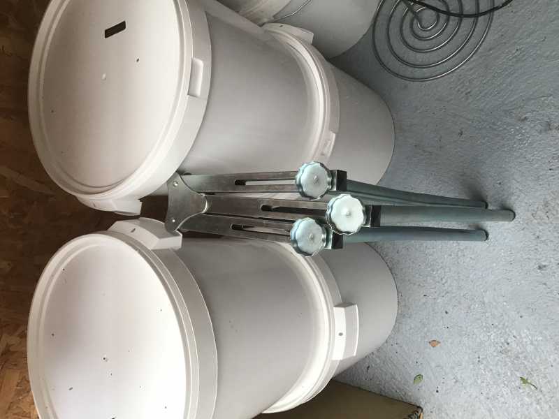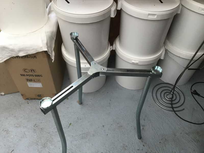 En suivant madame dans les magasins qui vendent de tous et n’importe quoi , j’ai trouvé un pied pour brûleur à paella , pliable et trois guides ( qui se vis ) pour le centrer . Je vous le présente avec un maturateur de 50 kg mais je vais l’utiliser pour le 200 kg . L’inter que j’y trouve , une hauteur pour la mise en pots quand je suis assis .