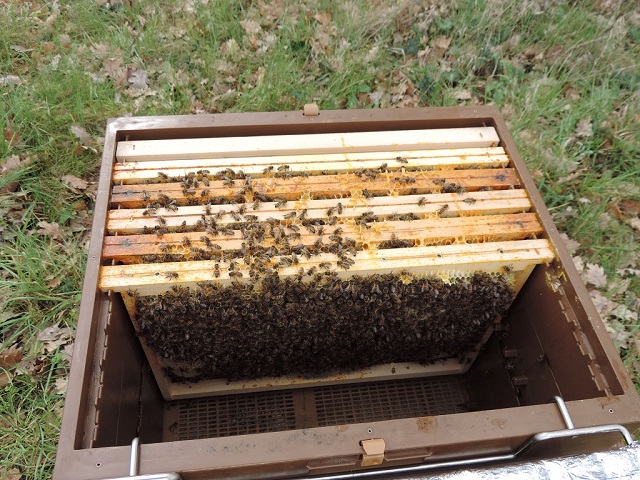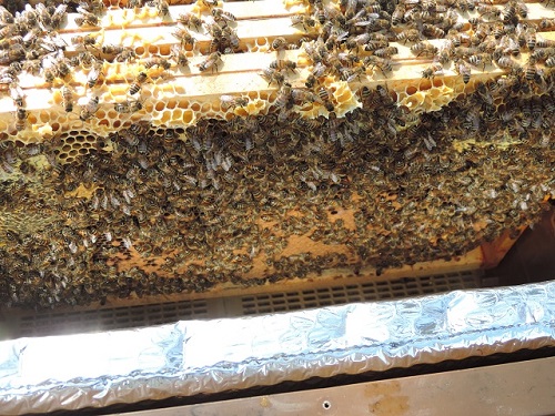 J’attends que mes cires à mâles soit finie de bâtir et ensuite si les cadres de rives sont toujours bourrés, je mettrais des cire gaufrée entière pour les remplacer et je garderai ces cadres pour les essaims (faut que je trouve comment les stocker en revanche…).