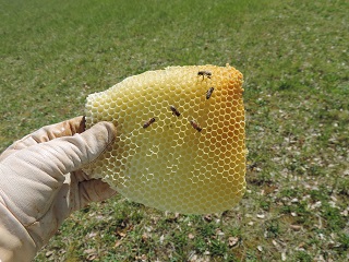Les colonies sont jolies, construction des cadres neufs en une semaine. 6 à 8 cadres de couvain. Il y a un peu de nectar en rive, et c’est correct au niveau du couvain. Elles ont mis un tout petit peu de nectar dans les hausses, mais avec ce vent… Sur la colo la plus forte, j’ai des cadres de hausses qui ont bougés, et du coup construction folles entre deux cadres. Que du couvain de mâles et un peu de nectar, j’ai tout ratiboisé.
