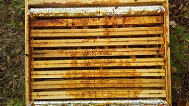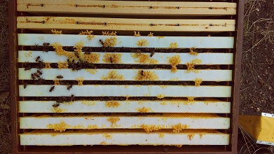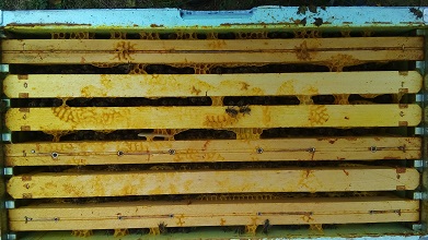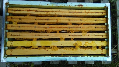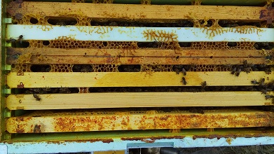 Inspection et récolte aujourd’hui. Pas de bourdonneuses, toutes les jeunes reines de juillet et aout sont en ponte. Ça fait 24 colonies en forme (contre 7 en sortie d’hivernage). Une seule est faiblarde (1 1/2cc sur 5 cadres) je vais la renforcer samedi avec un cadre de couvain naissant.