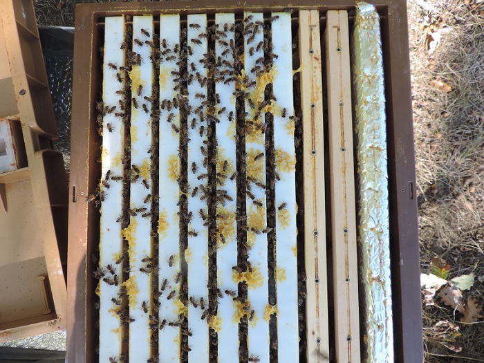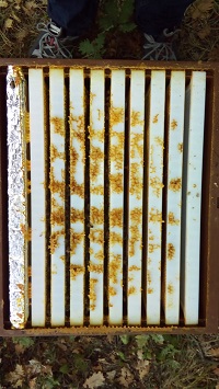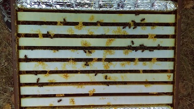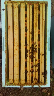 Au niveau des corps, belles réserves, les ruchettes 6c ont 3 cc et 3c de miel. Les 5c 3 de miel et 2 de couvain. Les colonies en ruche sur 8 cadres, 4 cadres de miel et 4 de couvain. Pas besoin de leur filer du sirop. Restera à finir le plein sur le lierre et elles hiverneront sur du miel