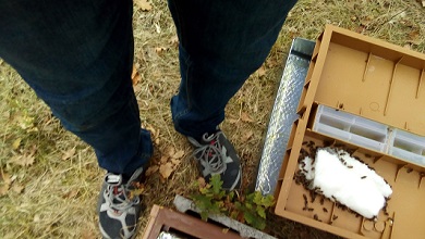 Sortie hivernage 2016 avec 7 colonies, 2 reines carnica, 5 hybrides carnica/locale, dans des ruches partitionnées.