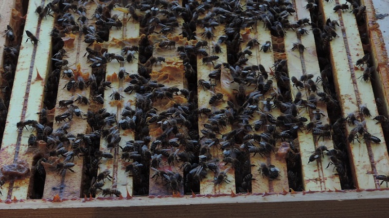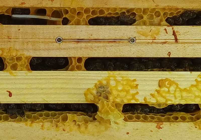 4 ruchettes de Carnica, quasiment plus de ponte, deux cadres de la taille d’un poing. J’ai vu 3 reines sur 4. Pas d’opercule crevée, pas de couvain chauve. Les abeilles sont belles, pas d’ailes déformées, pas vu de poux sur elles. Pas mal de pollen, et miel ok. Les deux ruches de buck, élevage beaucoup plus important. 3 cadres avec la moitiée du cadre en couvain. Vu 2 reines sur 2. L’apport de sirop a permis de remplir les cadres de rives qui sont operculés au 3/4. Il y a facilement deux fois plus de Buck sur les cadres que chez les Carnica.