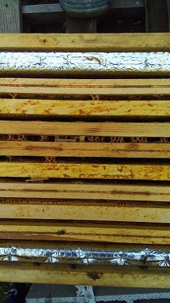 Cette année, sur quasi toutes les colo, les deux cadres de rives sont moitiés operculés et 1/4 pas operculé et celui à côté est au 2/3 operculé et il restait quelques cellules en bas sans nectar. Ensuite les cadres d’élevage c’est 1/3 à 1/2 miel operculé, 1/3-pollen (elles ont fait de sacré stock), et le reste élevage.