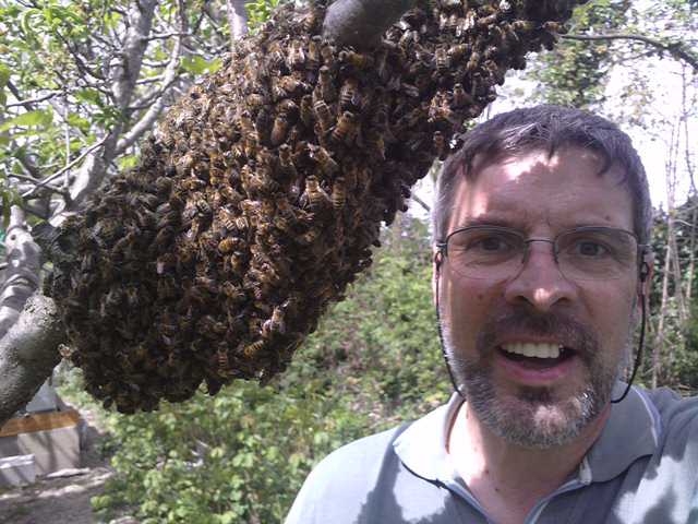 Mais l’émotion qui me vient spontanément c’est celle ressentie en arrivant au rucher ce printemps, après des années à espérer voir un essaim, et là,sur le chemin, à hauteur des yeux cette grappe noire, serait-ce … ?