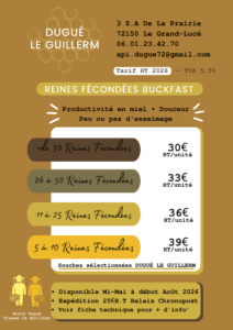 • Reines F1 Buckfast 2026 marquées contrôle de la ponte • Issues de nos croisements • Productivité en miel, tempérament[...]
